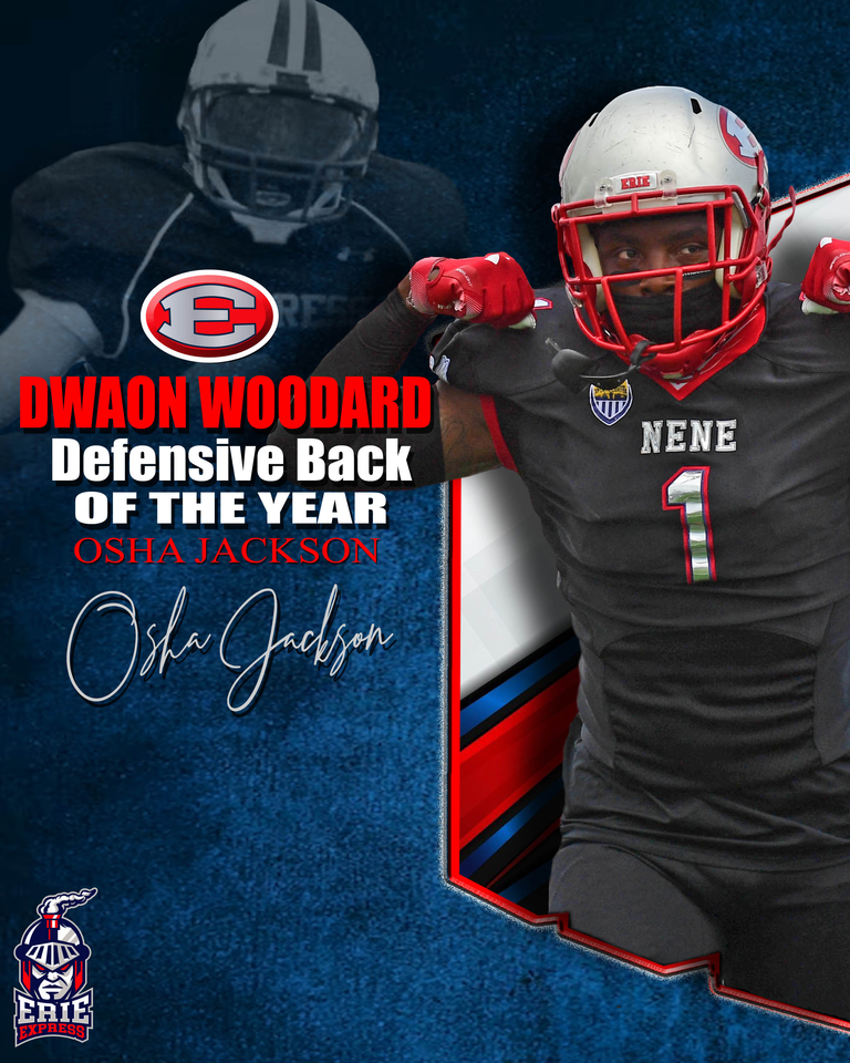 O'Sha was also named the Erie Express- Daryk Maki-Defensive Player of the Year. This award is voted on by O'Sha's teammates and coaches and is named in memory of All-Pro DL-Daryk Maki. O'Sha won the same award last season. In addition to this award, O'Sha was also named the Dwaon Woddard Erie Express Defensive Back of the Year, the award is named in memory of All-Pro DB-Dwaon Woodard.