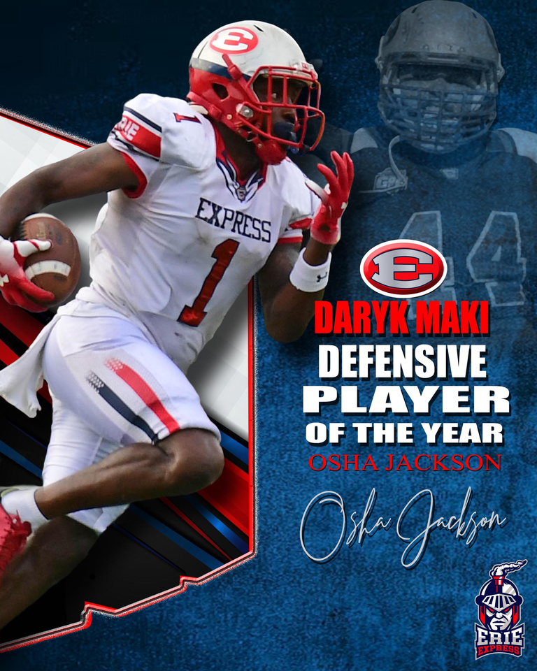 Jackson received Erie Express Team Awards as: Most Valuable Player of the Year. The award is voted on by O'Sha's teammates and coaches and goes to the player that had the biggest impact in our overall team success on and off the field. "Daryk Maki"-Defensive Player of the Year, Defensive Back of the Year and Comeback Player of the Year.