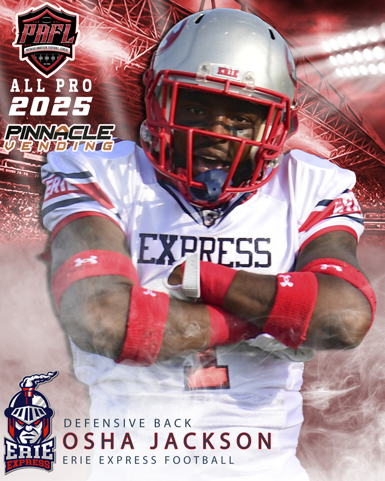 The Erie Express are pleased to announce the return of 4x All-Pro and Team Captain, DB-O'Sha Jackson (Ohio Dominican University) for the 2026 season. Jackson begins his sixth season with the Express and is a returning starter in the defensive secondary.