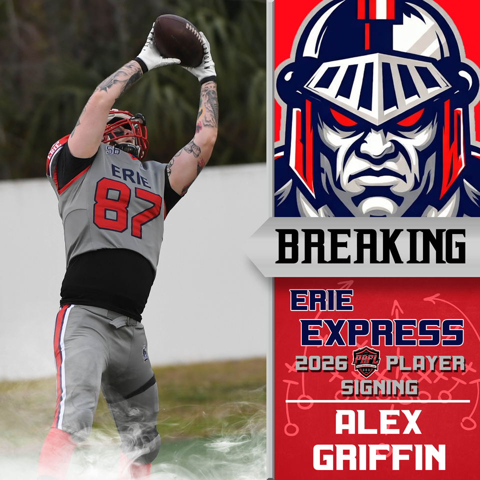 The Erie Express are pleased to announce the return of TE/DE-Alex Griffin (Colorado Mesa University) for the 2026 season. Alex begins his third season with the Express and returns as one of our starting specialists. Alex helped lead us to the 2025 PAFL playoffs in our first year back in the league.