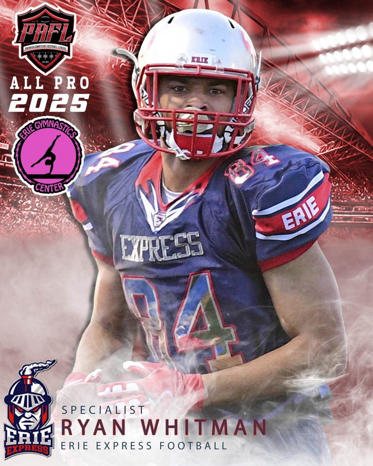 Last season Ryan did an amazing job for us and played a major role in our PAFL Playoff game appearance. For his efforts Ryan was named the Erie Express Special Teams Player of the Year. This award is voted on by Ryan's teammates and coaches. This is the second season in a row Ryan has earned this award. In addition to this team award, Ryan was also named PAFL All-Pro for the season.